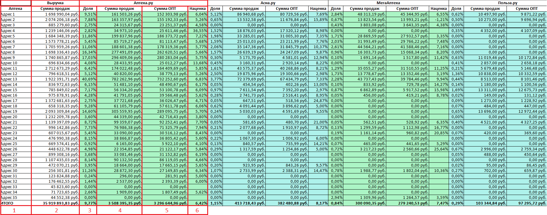 Отчет позволяет определить долю продаж на маркетплейсах от выручки в рамках отдельных аптек и от общей выручки. Для более удобного ориентирования в отчете, блоки отдельных маркетплейсов разбиты по цвету.