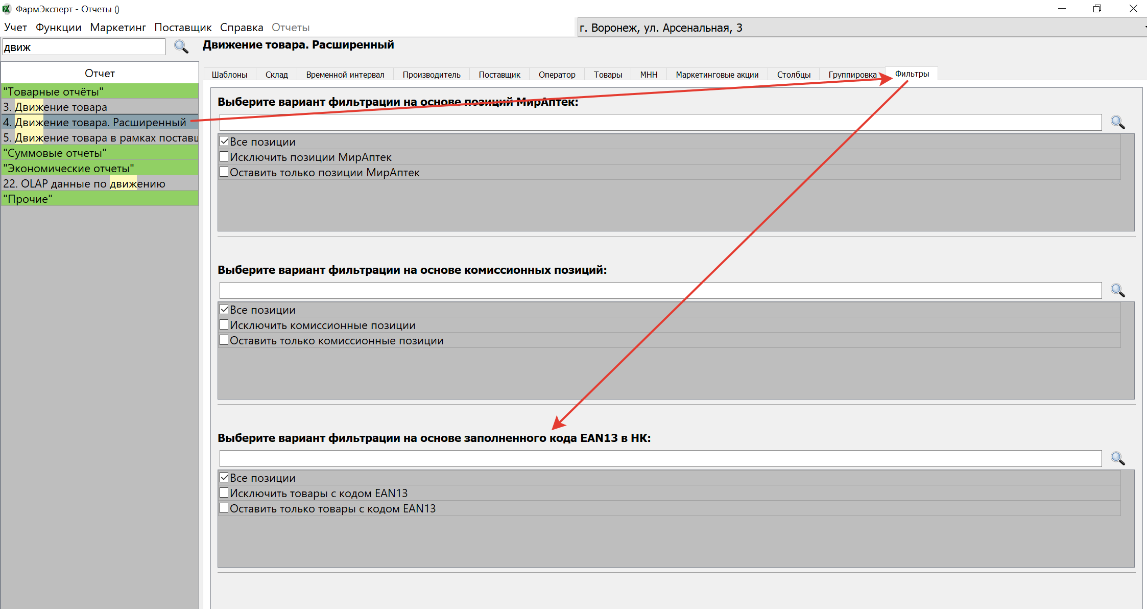 В дополнение для проведения аналитики, в отчет 4.Движение товара. Расшиненный, добавлена возможность фильтровать получаемые данные в зависимости от наличия у них кода EAN-13