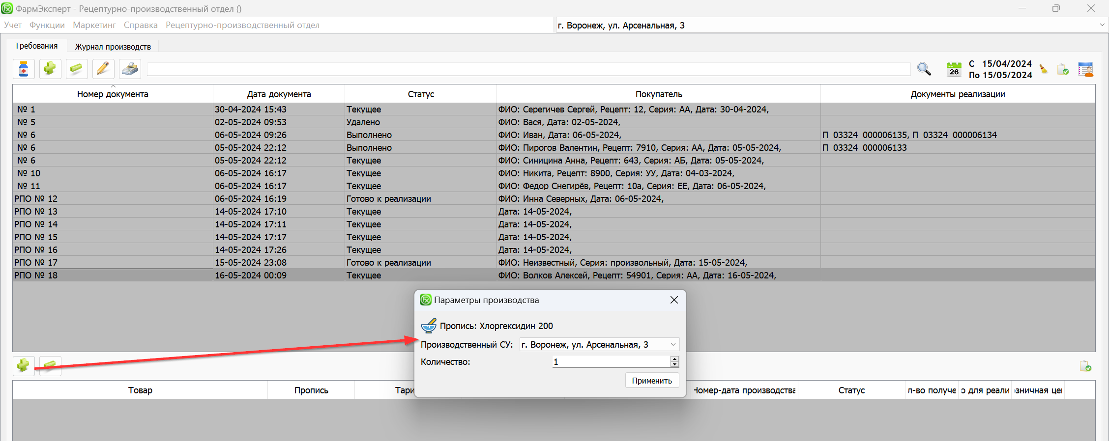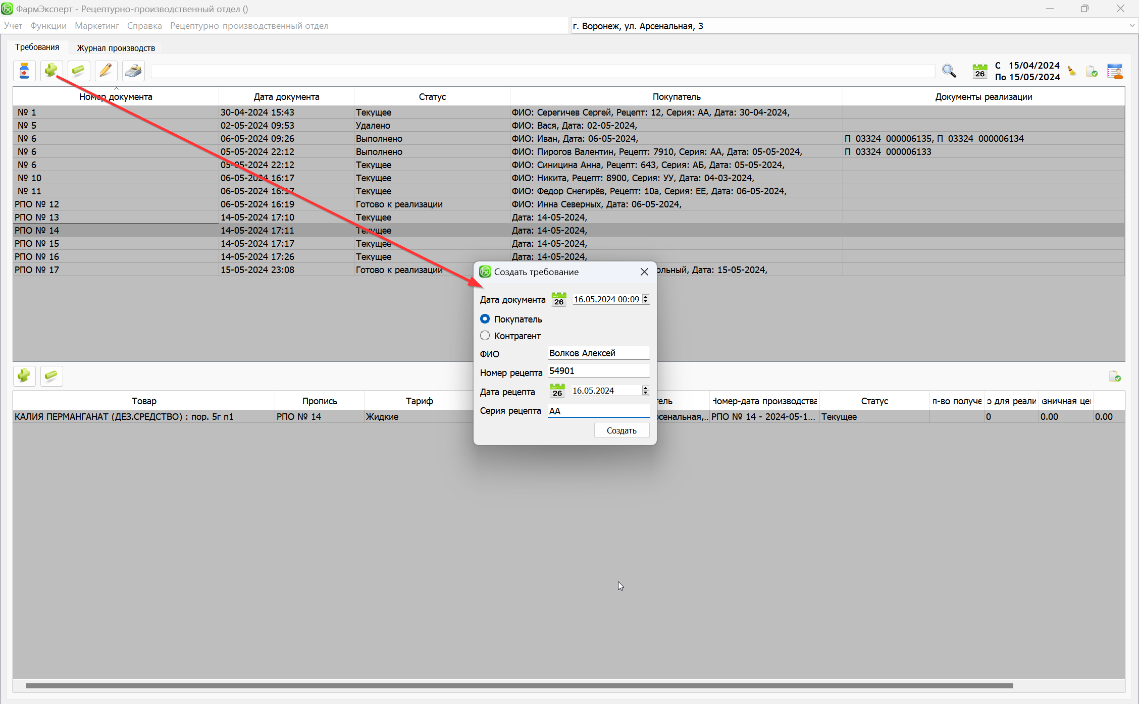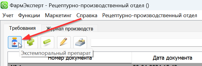 Также существует возможность завести требование с произвольным экстемпоральным препаратом, то есть содержащим произвольный состав прописи и дозировку ингредиентов. В этом случае окно внесения требования совмещено с окном сбора прописи. Таким образом за одну операцию можно выполнить несколько шагов