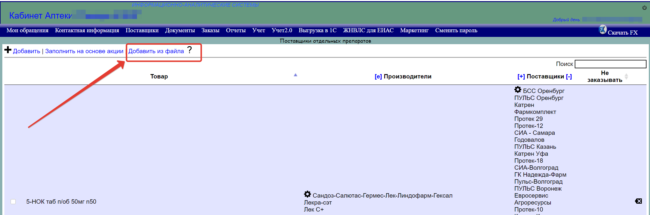Второй полученный файл имеет имя Рекомендованные поставщики АСНА для импорта в FX содержит данные о разрешенных к заказу поставщиков по маркетинговым товарам. В зависимости от объёма данных он может быть разделен на несколько. Данный файл (-ы) используется для загрузки в раздел «Поставщики отдельный препаратов». Если файлов несколько то они загружаются в данный раздел последовательно.