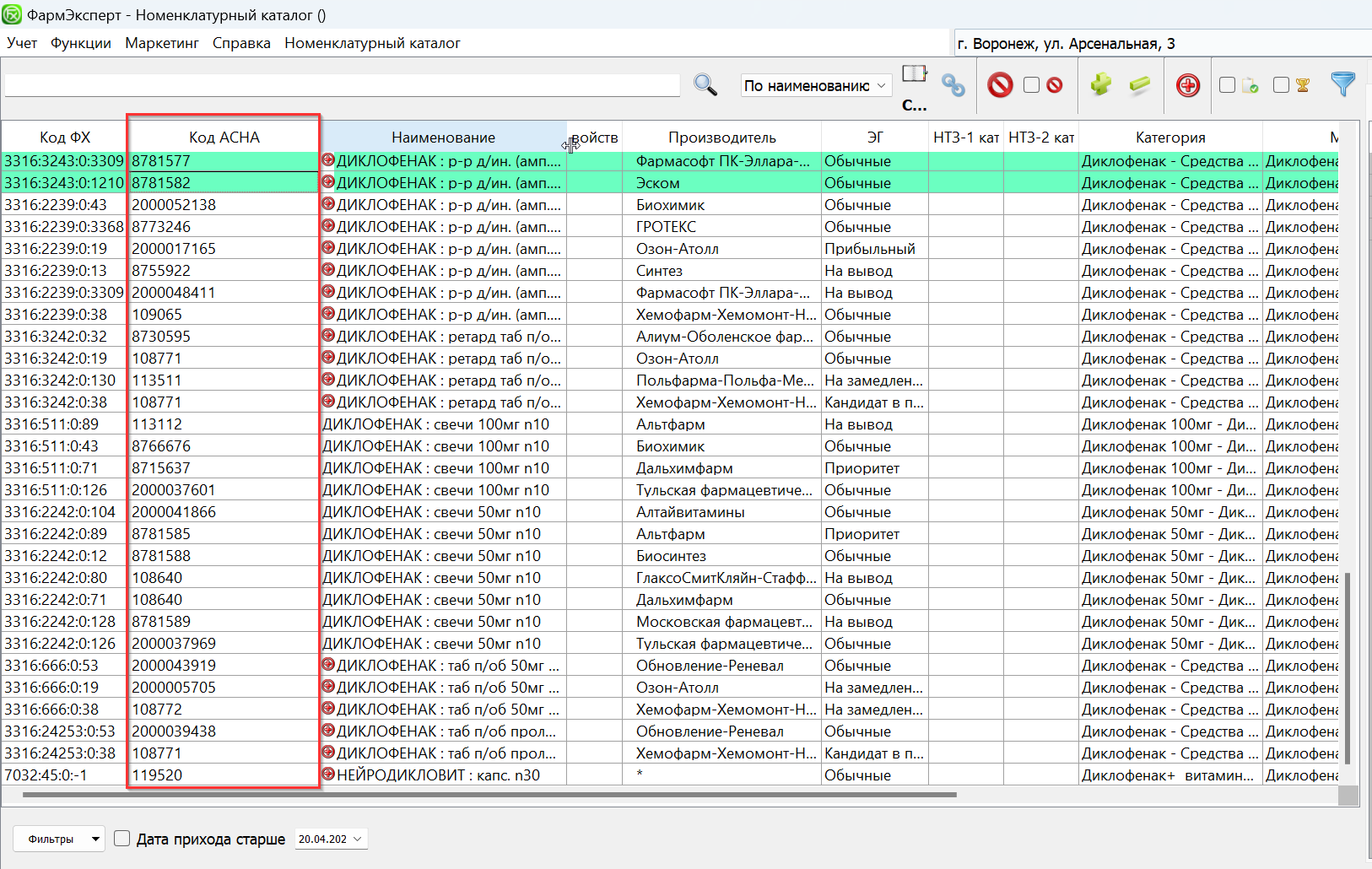 Для того, чтоб наряду с использование кода товара ФармЭксперт, работать в программе с кодами ННТ (код товара в справочнике АСНА) необходимо в сервисе данной аптеке произвести настройки обмена, установив параметр "Интеграция только для получения кодов товаров по справочнику АСНА". В результате КОД АСНА будет присутствовать в номенклатурном каталоге, а также в отчетах, имеющих колонку «Код АСНА/ННТ». Поддержка актуальности кодов происходит также на стороне АСНА, а через доступный интерфейс портала АСНА для проведения связок. Загрузка кодов из АСНА в ФармЭксперт происходит каждые 3 часа. Таким образом сопоставления, проведенные на портале АСНА и принятые ими, будут загружены в ФармЭксперт в течение 3-х часов.