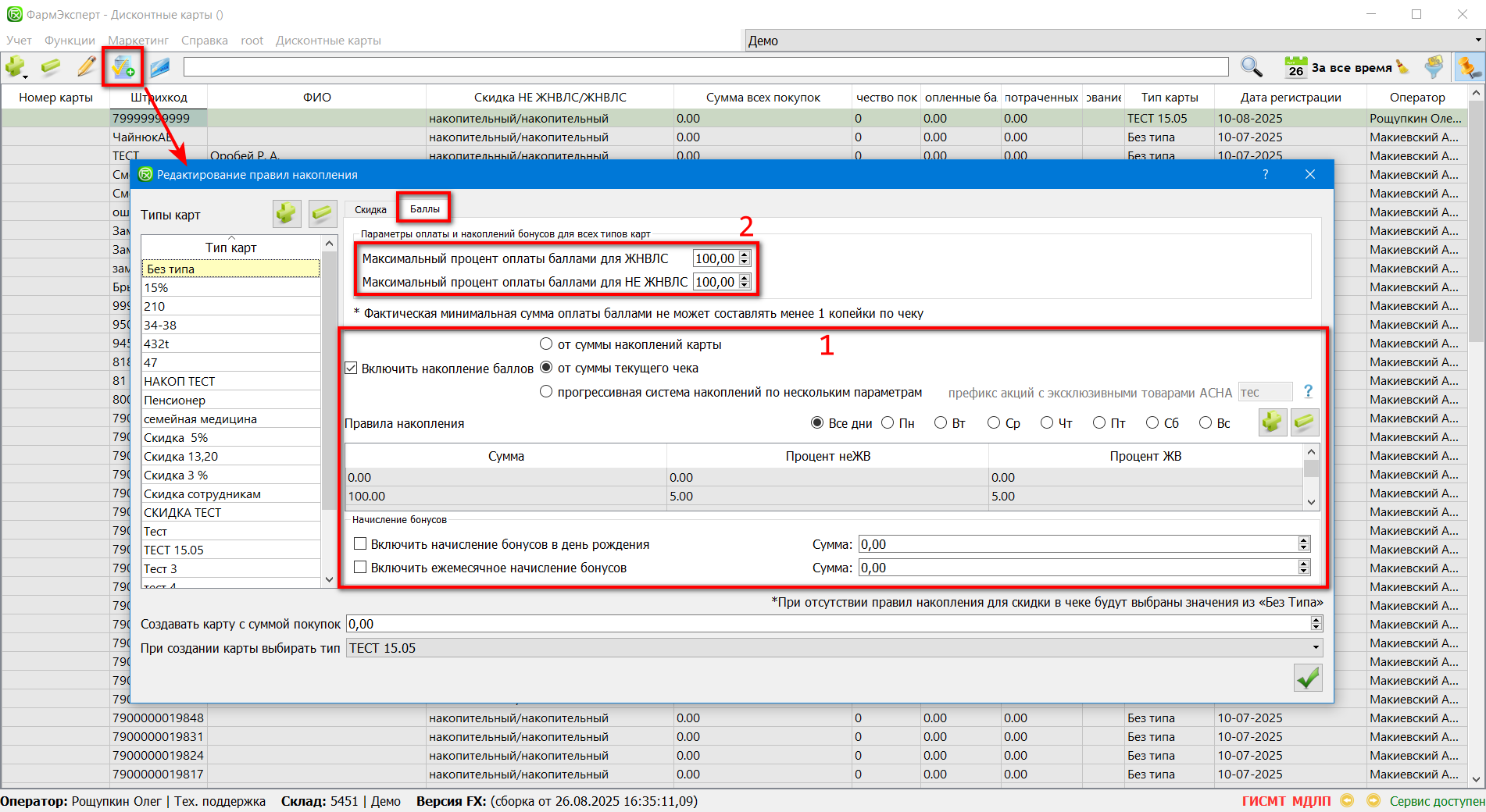 По каждому типу дисконтных карт можно настроить правила использования баллов. Для этого в разделе Дисконтные карты откройте окно «Правила накопления».