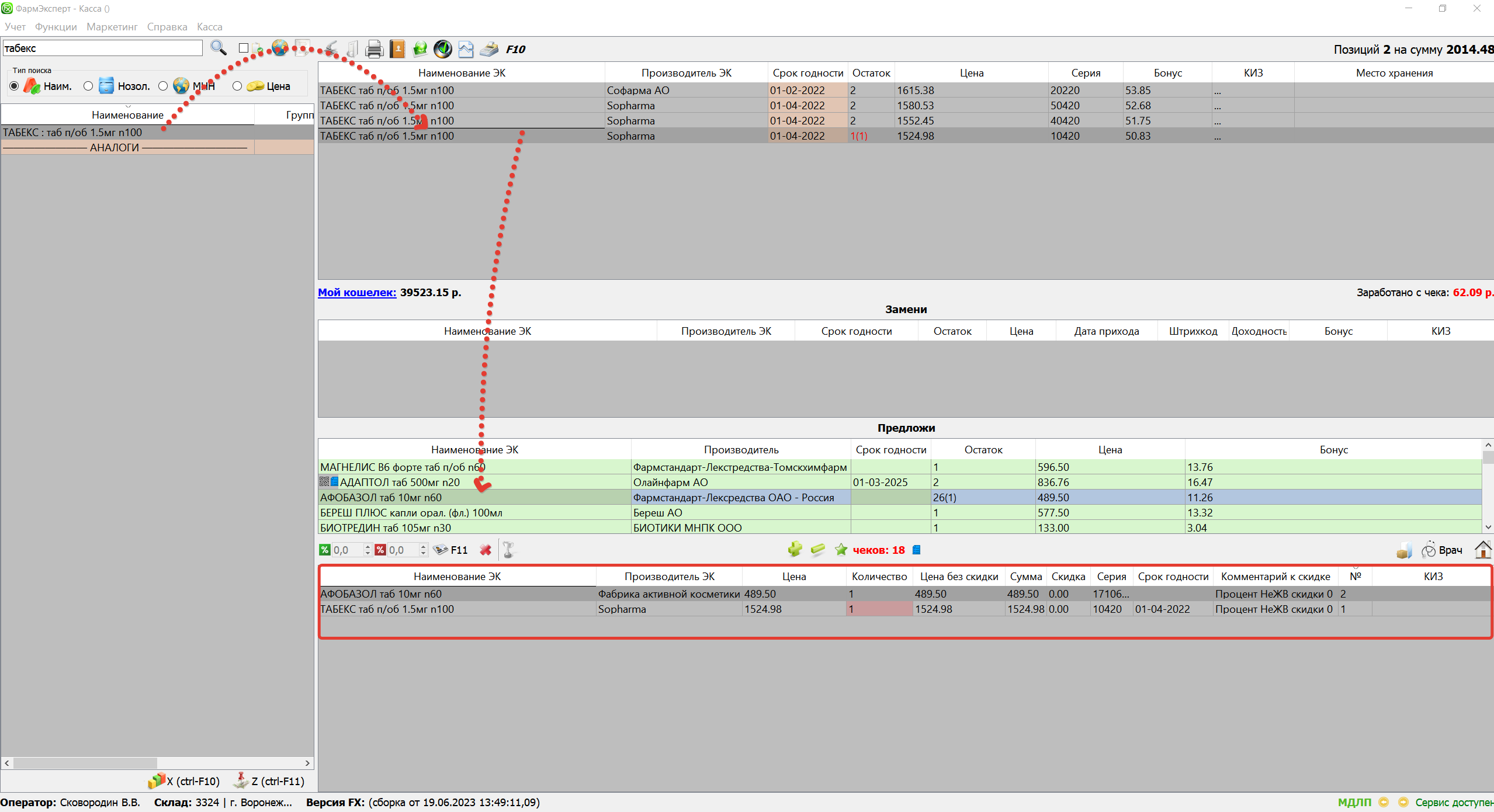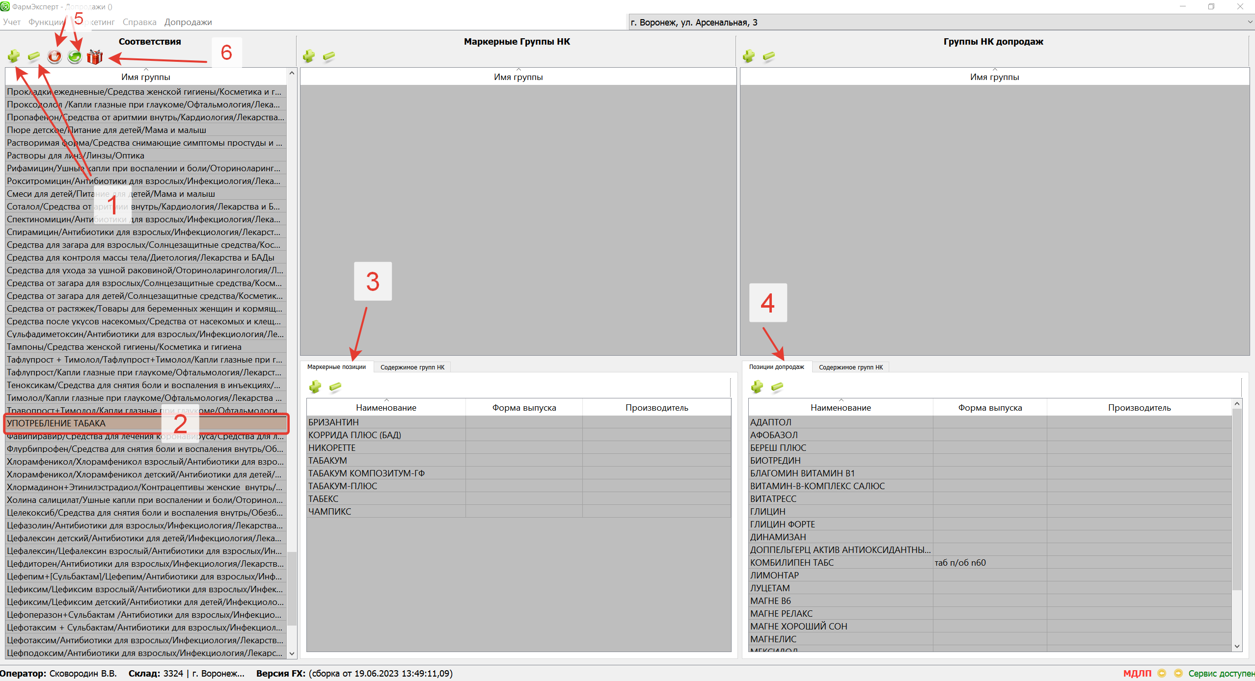 Дайте название созданной вами группе (2). Далее необходимо добавить маркерные товары (стрелка 3), то есть товары, выбрав которые на кассе, будет срабатывать допродажа. Указывать можно только название товара, без формы выпуска. В этом случае все формы выпуска данного товара будут считаться маркерными (Например, в маркерные товары может быть добавлен Азитромицин без указания какой-либо формы выпуска для настройки в допродажи пребиотиков). В блок допродаж добавьте (стрелка 4) товары, которые будут предлагаться в качестве допродаж. Тут также работает аналогичное правило с возможностью выбрать как конкретную форму выпуска, так и просто товар в целом. Настроенная вами группа допродаж может быть включена или выключена в работе функциональными кнопками на панели (стрелка 5). Функция автоматического добавления в чек товара из блока допродаж (стрелка 6) используется для «допродажи» дисконтных карт, подарков при открытии аптек и пр.