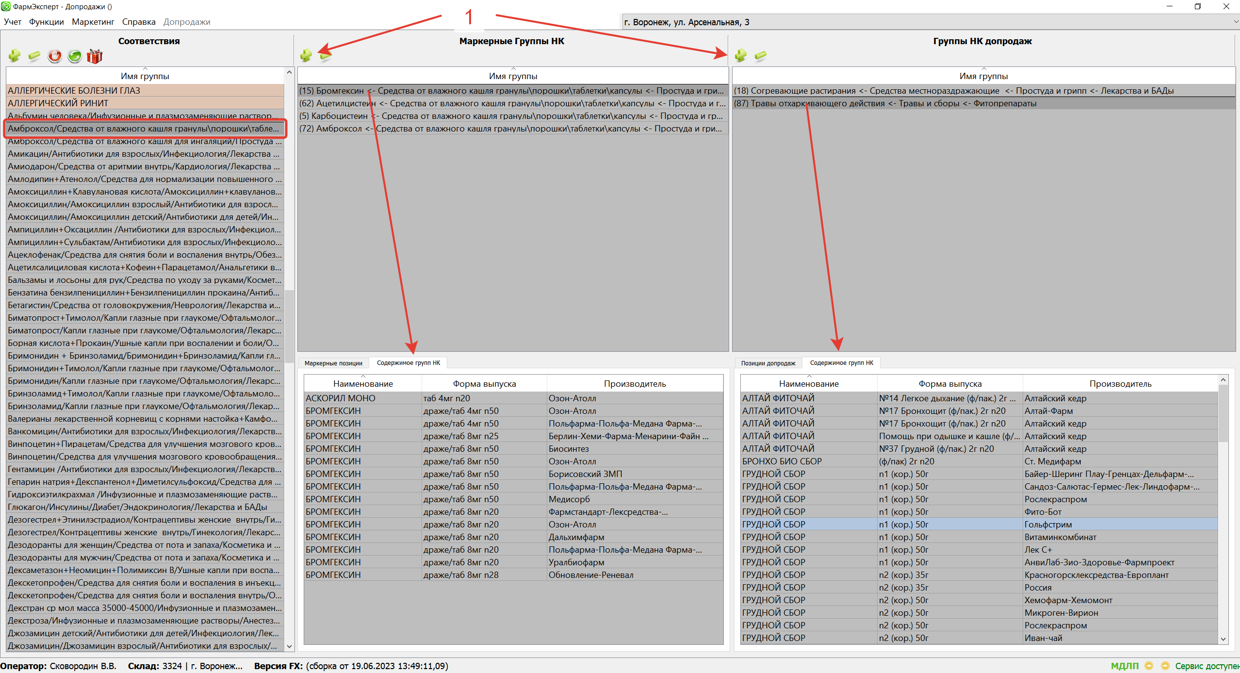 Таким образом, в созданной группе допродаж существует добавить группу товаров Номенклатурного каталога (стрелка 1), а содержимое по товарам этих групп отображается во вкладке «содержимое групп НК»