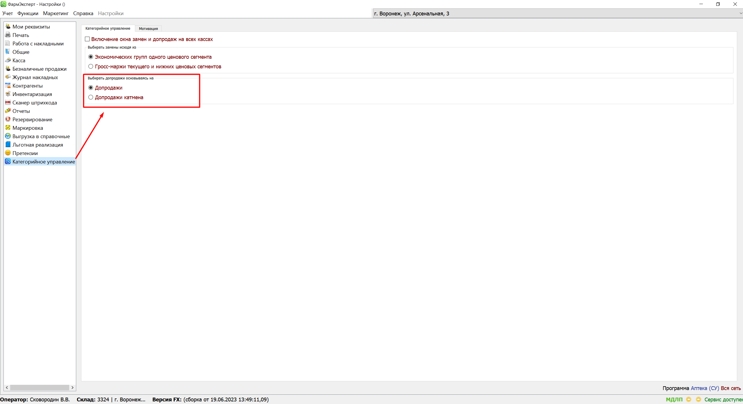 Функционал допродаж направлен на настройку отображаемых на кассе товаров в окне "предложи". Допродажи также могут работать в режиме категорийного управления, то есть с учетом экономических групп и доходность. Тип режима работы допродаж устанавливается в настройках. Для начала создайте группу, которая будет содержать маркерные товары или группы и допродажи (стрелка 1).