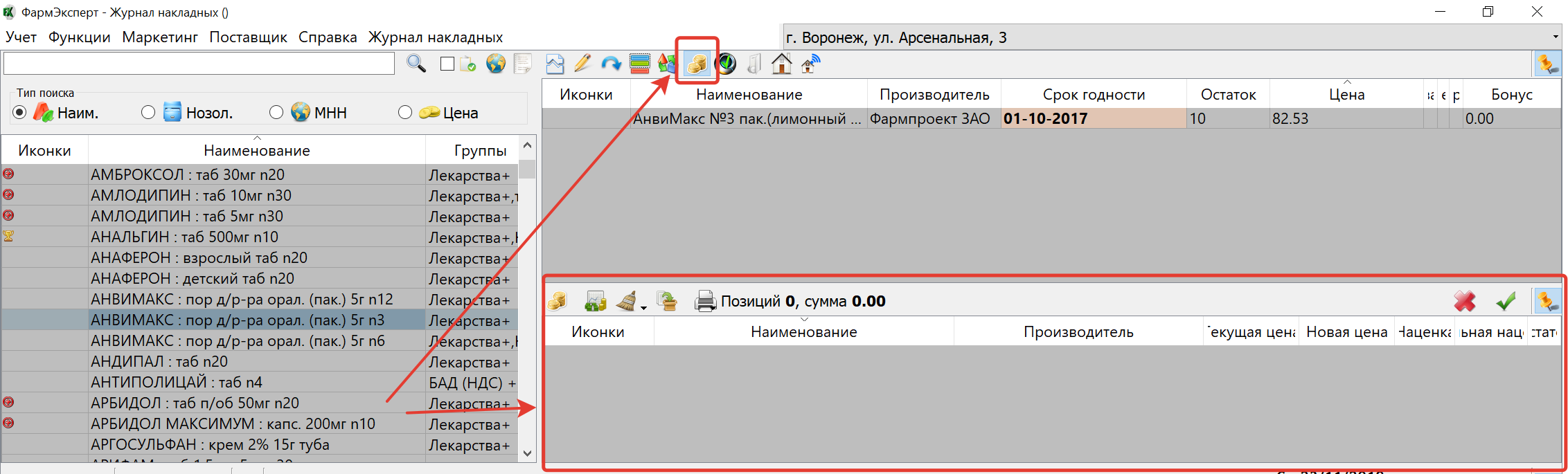 При установке различных цен к текущим позициям в переоценке можно воспользоваться фильтром (стрелка 3) для удаления лишних позиций, которые не должны участвовать в переоценке (позиции интернет-заказа, без изменения розничной цены, позиции с нулевым остатком или позициям, по которым недавно уже проводилась переоценка).