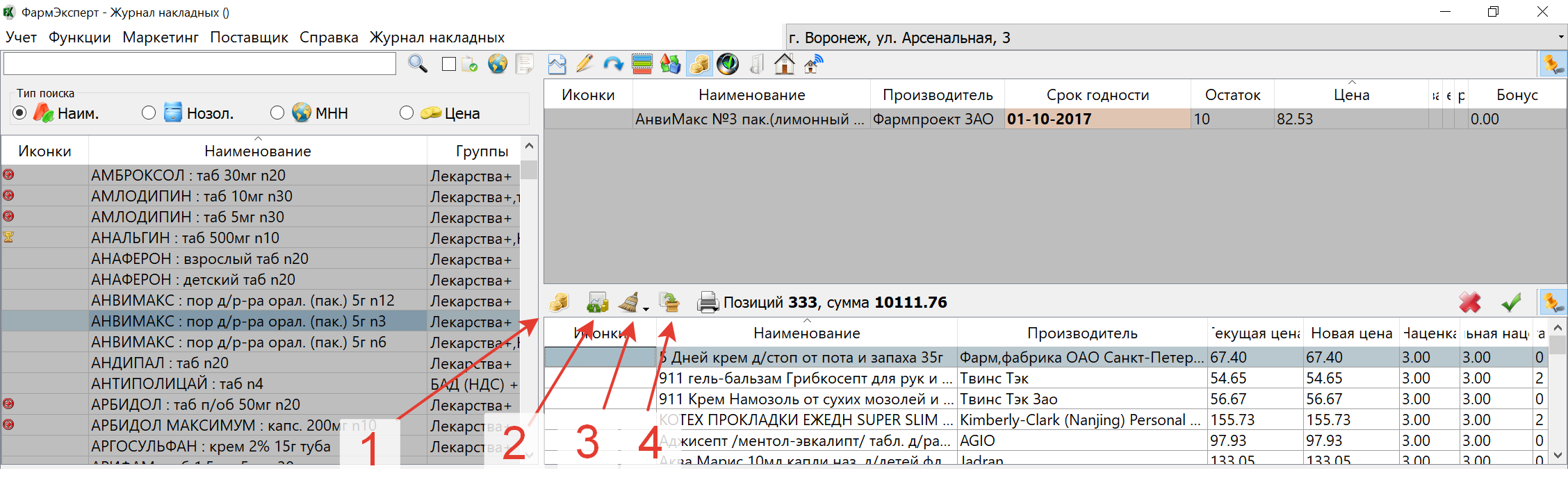 Позиции в текущей переоценке можно переоценить по одному из шаблонов расценки (стрелка 1). В этом случае также будут применяться связанные шаблоны фиксированных цен. Преоценка может быть проведена в режиме установки наибольшей цены среди таких же позиций на остатках (стрелка 2). Также переоценка может быть проведена по только по шаблону фиксированных цен или по шаблону фиксированных цен с учётом цен для расценки в действующих акциях (стрелка 4). Это будет зависеть от установленного параметрах Учёт-Настройки-Журнал накладных