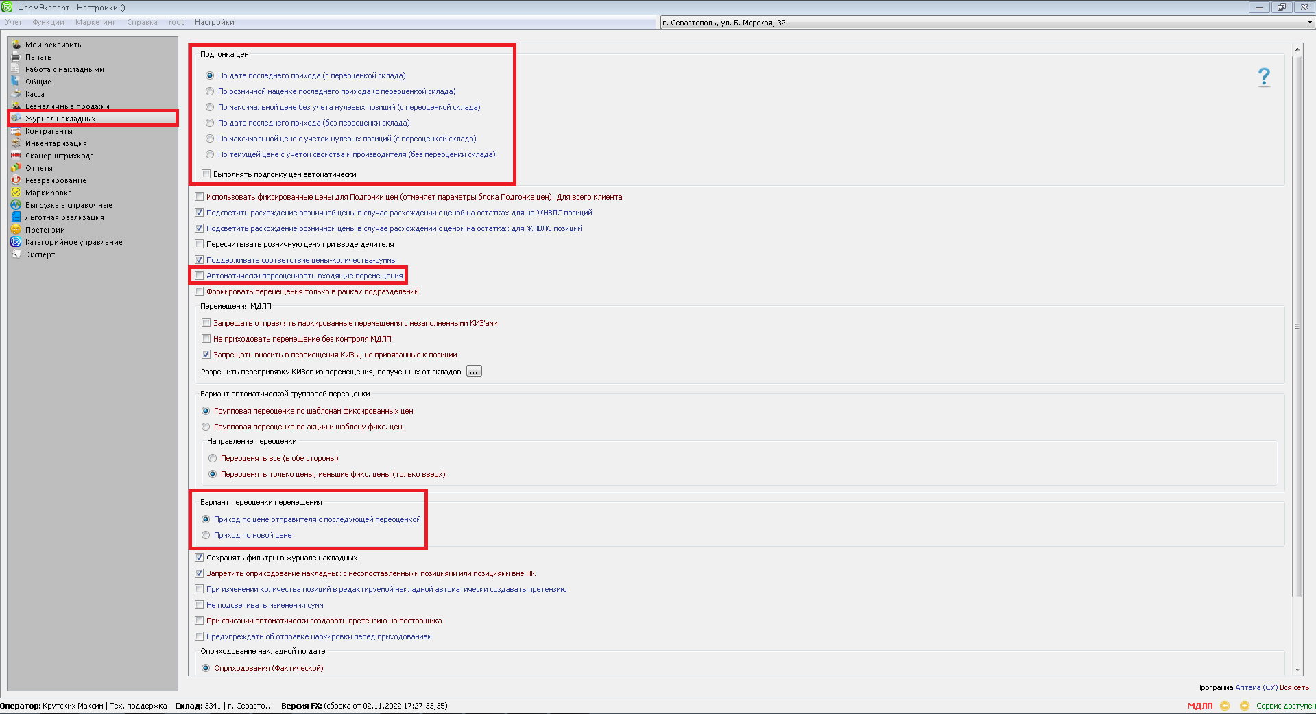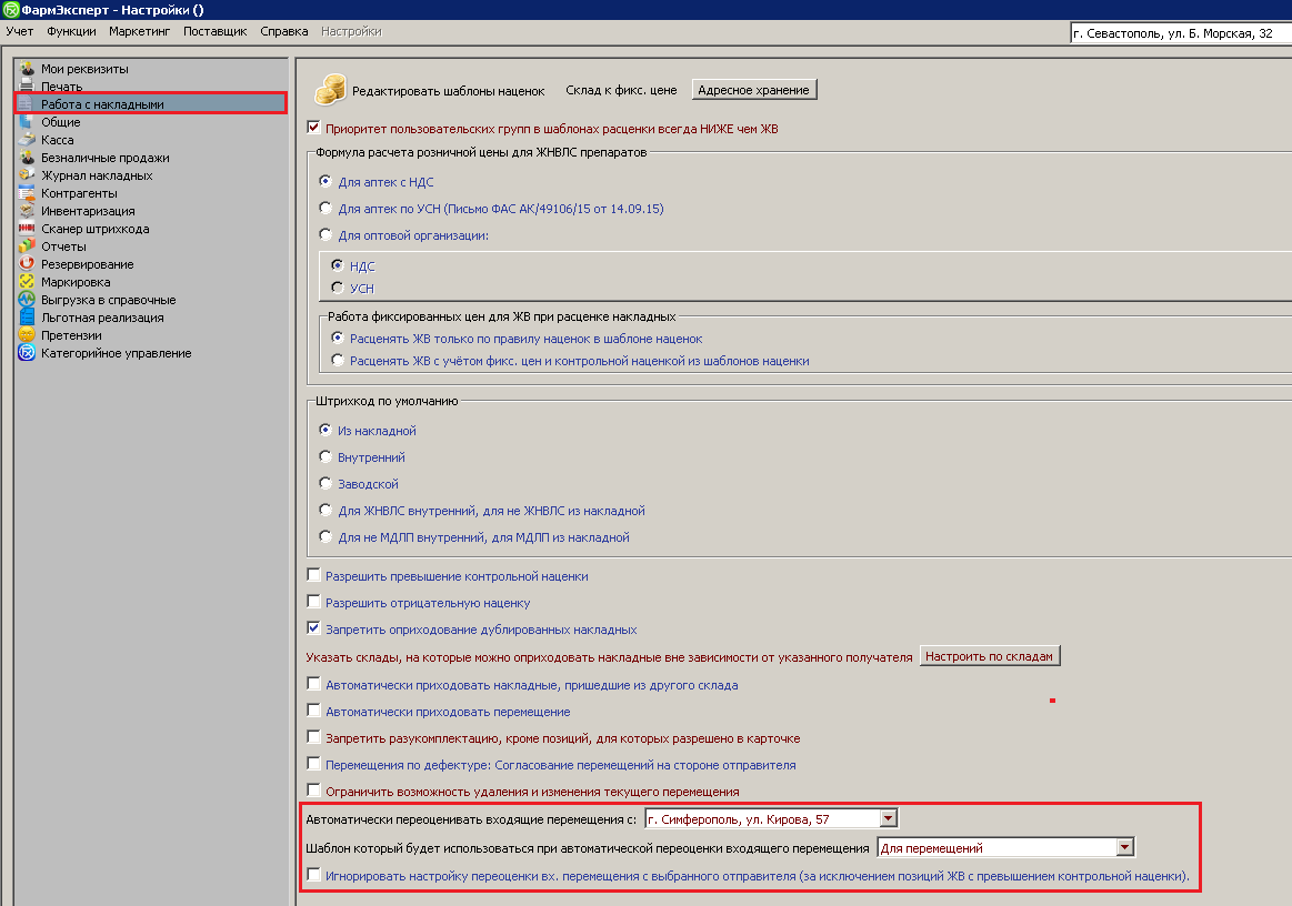 ФармЭксперт предоставляет возможность автоматической переоценки перемещений. Чтобы ее задействовать, зайдите в Учет-Настройки-Журнал накладных.