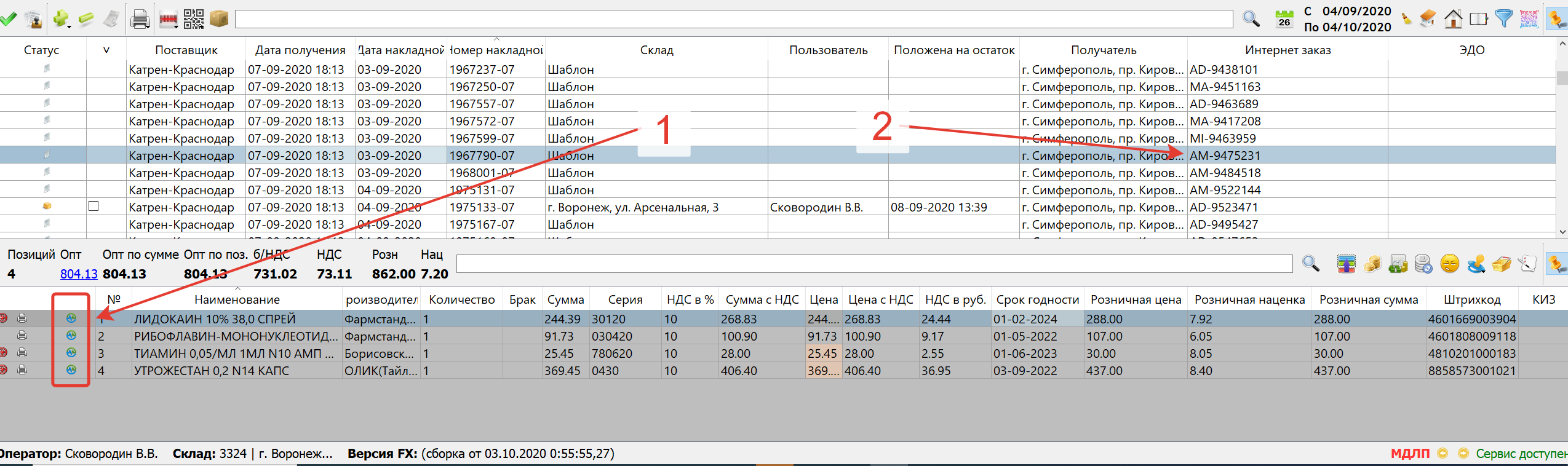 ФармЭксперт позволяет работать с накладными, пришедшими по товарам интернет-заказов (интернет-магазинов). Данные накладные имеют соответствующую иконку (стрелка 1), а также в содержат номер интернет-заказа (стрелка 2)