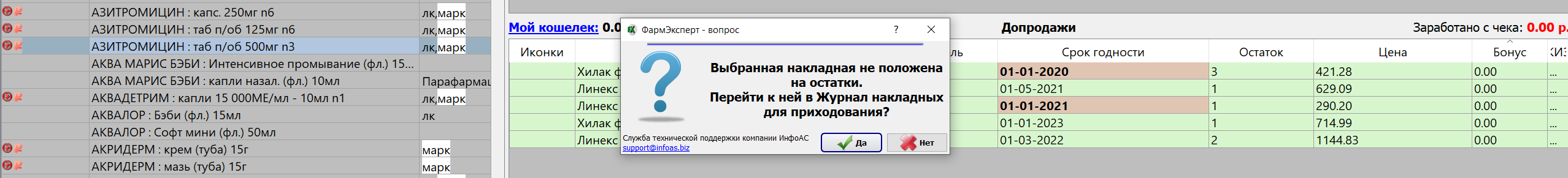 Если накладная с искомым интеренет-заказом ещё не положена на остаток, то ФармЭксперт предложит оприходовать наклданую и переведёт в журнал накладных (для оператора должна быть включена привилегия «Работа с текущими интернет-заказами»).