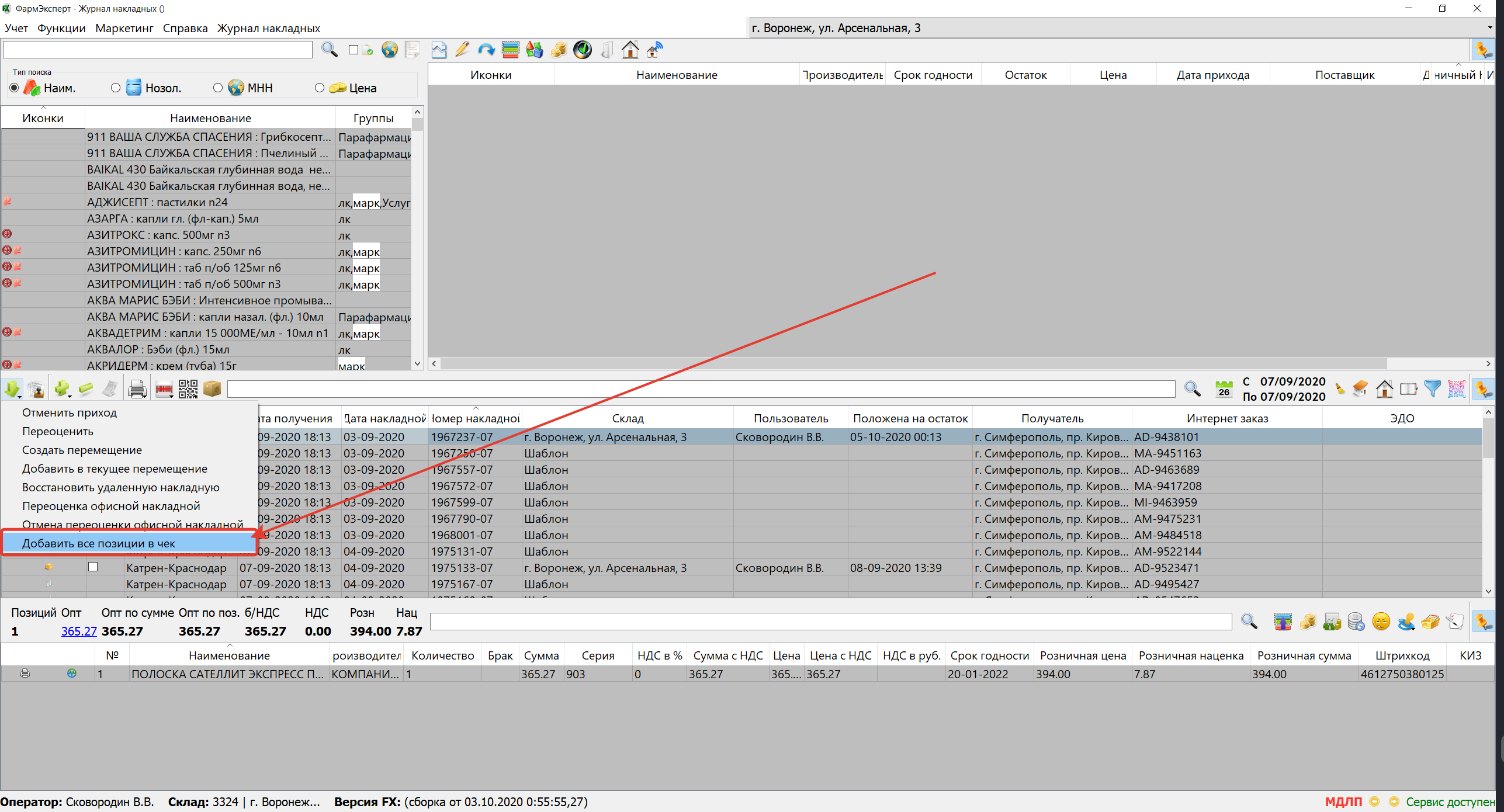 После оприходования накладной выберите пункт меню по накладной - Добавить все позиции в чек