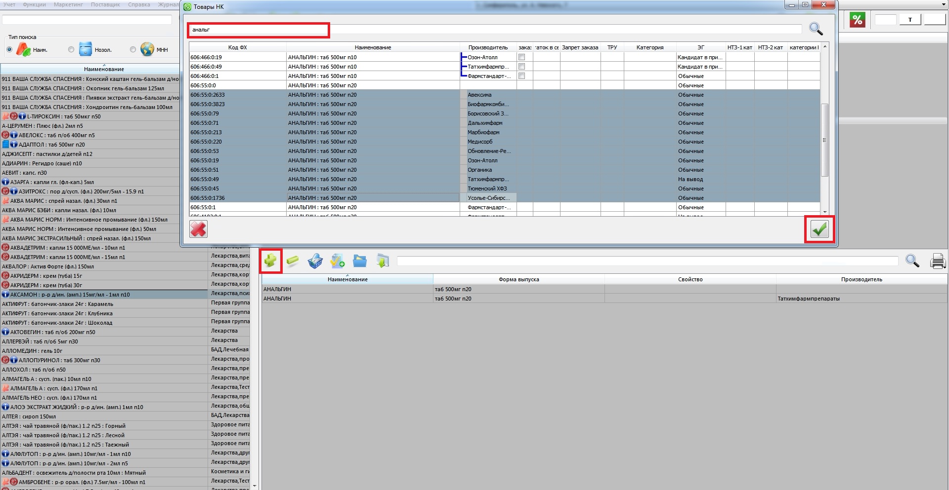 - нажав на + в нижнем окне с позициями, в этом случае добавится товар с конкретным свойством и производителем. В открывшемся окне с помощью поисковой строки выберите нужные строки. Так же в этом окне можно выбрать сразу множество товаров, для этого при зажатой кнопке SHIFT последовательно нажмите на все интересующие вас товары, если они располагаются в списке не рядом, либо на первый и последний товар, если они располагаются по порядку, при этом выбранные вами товары будут подсвечиваться, как в примере на скриншоте. Для добавления выбранных товаров внизу справа нажмите на Галочку.