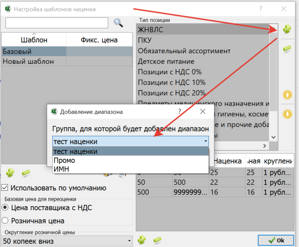 Расценка товаров может происходить также по пользовательским группам, предварительно созданным в соответствующем разделе. Для установки индивидуальных правил расценки на данные группы следует их добавить в разделе Шаблон наценок
