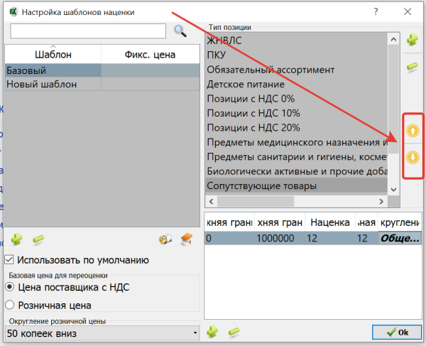 и настроить наценки по данной группе товаров, как это описано выше. Если позиция принадлежит нескольким «типам позиций», то расценка будет происходить по тому типу, который выше в приоритете , а именно в выше в списке. Управление приоритетом производится перемещением группы «тип позиций» с испольованием стрелок слева