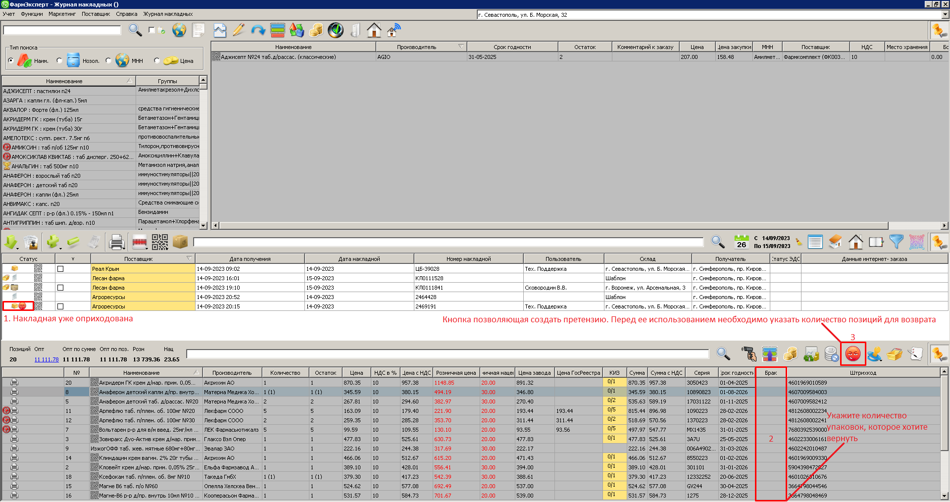 Если при приемке товара возникли основания для его возврата поставщику, то можно использовать функционал работы с претензиями. Для этого, уже после оприходования накладной (1), в одной из колонок брак/бой/недостача (2), укажите количество, которое нужно вернуть (это количество станет зарезервированным, чтобы никто не мог продать/списать/переместить его).