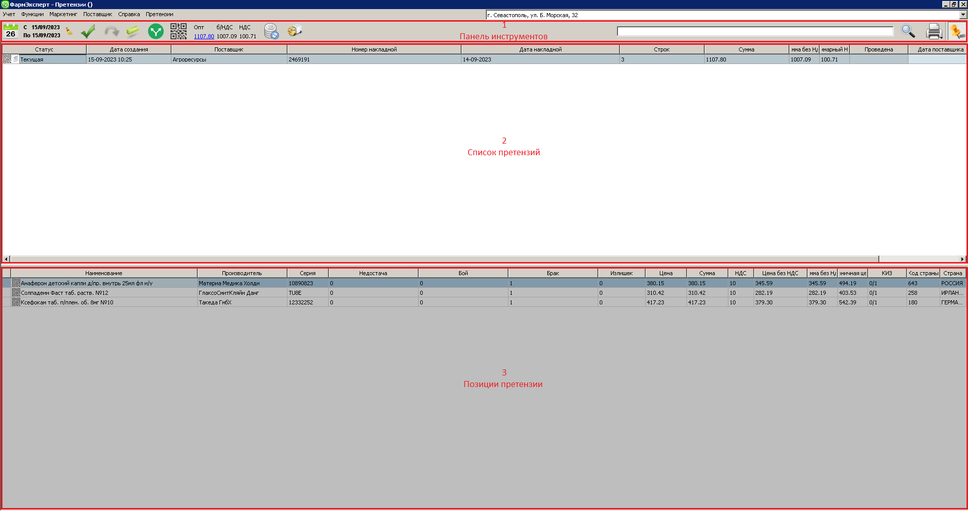 - Содержимое претензии. Тут отображаются позиции претензии, которая выбрана в списке.