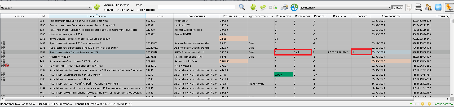 В алгоритм работы этой опции внесены изменения. Теперь, когда она отключена, после проведения продажи на кассе, в инвентаризации изменяются значения в колонках «Фактически» и «Количество», а в колонке «Продажа», указывается количество проданных позиций. Пример. Изначально, у позиции «Аджисепт табл д/рассас (апельсин) х24» количество было равно «3». «Фактически», тоже было внесено, как «3». После этого, на кассе провели продажу «1» упаковки. В итоге, мы видим, что значение колоки «Количество» изменилось на «2», а в «Фактически» указано «3-1». Если закрыть инвентаризацию, то фактическое значение станет равным двум. Обратите внимание на то, что значение в колонке «Фактически» не будет меняться после проведения продажи, если его еще не вносили вручную.