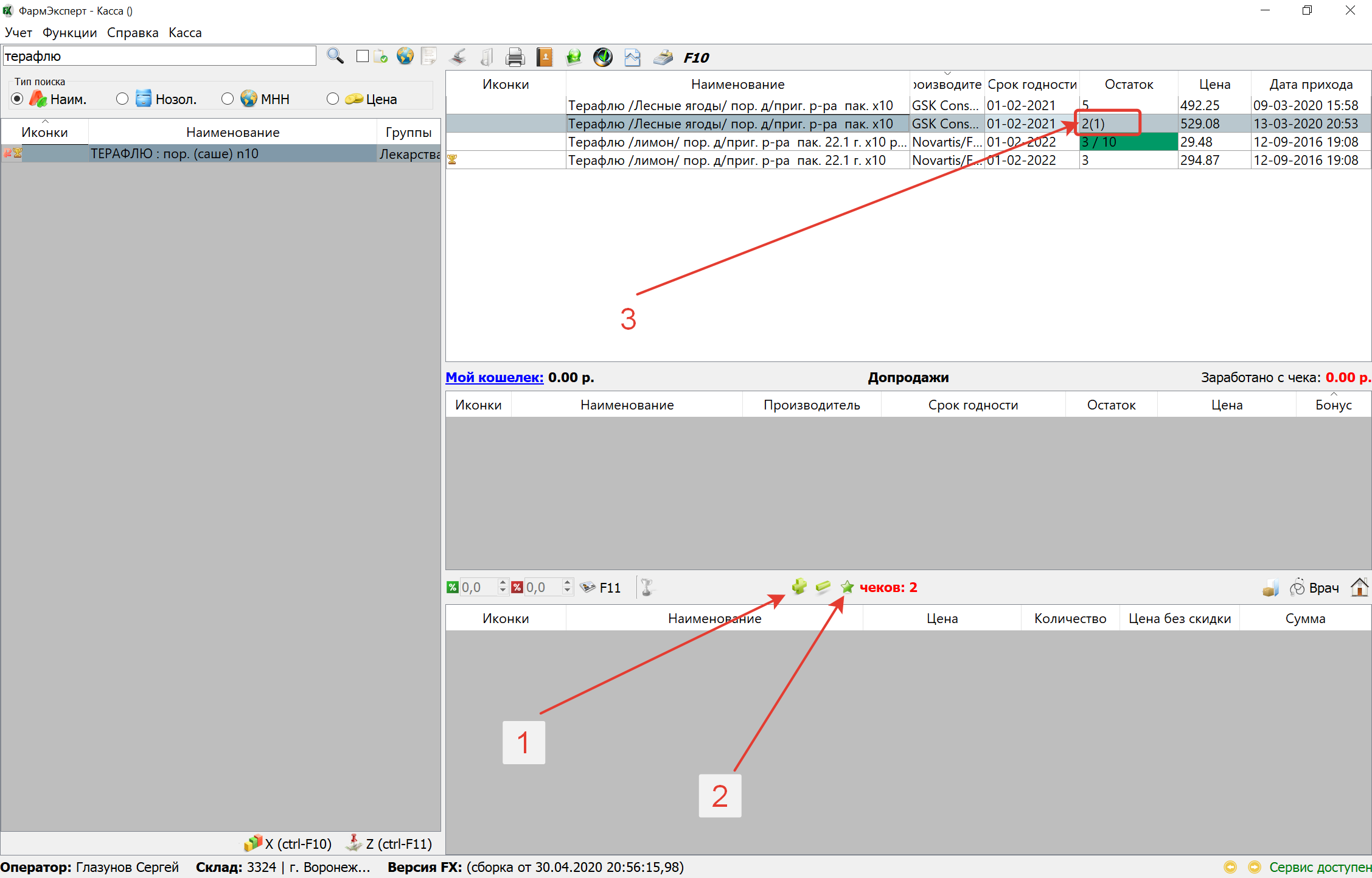 Для того, чтобы добавить текущий чек в отложенные, в кассовом интерфейсе достаточно на кнопку с изображением синего плюса (стрелка 1). Во время отправки чека в отложенные можно добавить ему примечение. Это упростит впоследствии поиск нужного отложенного чека. Увидеть список отложенных чеков можно нажав на кнопку с изображением зелёной звезды (стрелка 2). Нажав на неё нужно будет сначала выбрать необходимоый вам чек после чего он сразу же будет добавлен в текущий. Также для удобства работы первостольника в таблице остатков отображаются данные о количестве товара, находящегося в резерве по отложенным чекам (стрелка 3). Данные о резерве отображаюся в скобках.