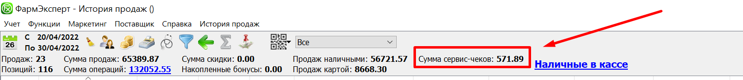 - Режим проведения всего чека как сервисного. В этом режиме при проведении чека через специальную кнопку, на ккм будет распечатан сервис-чек. Данные по таким чекам фиксируются в метке сервис-чеков в Кассе предприятия, истории продаж