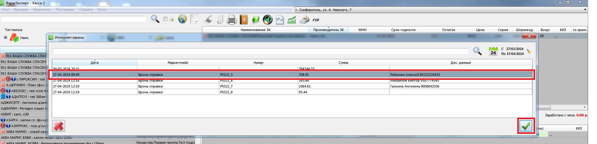 Для отправки выбранной брони в чек нажмите зеленую галочку внизу окна справа, после чего будет добавлен отложенный чек, с которым далее можно проводить продажу.