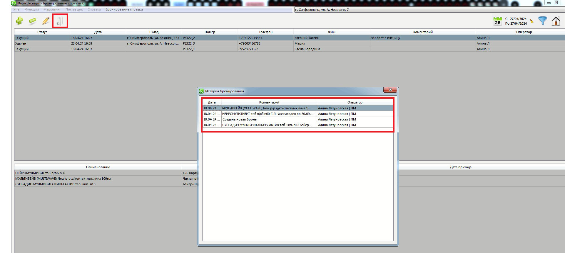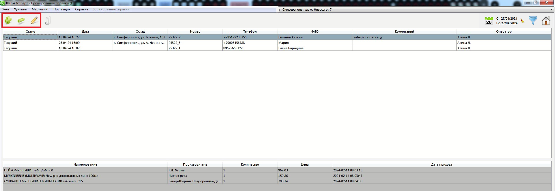 Новая созданная бронь имеет статус «Текущий». В этом статусе ее можно редактировать из раздела Бронирования справки, а так же при необходимости удалять. В случае, если первостольник взял в работу текущий заказ и статус брони поменялся, дальнейшее редактирование для оператора справки становится недоступным. Для удобства просмотра броней можно воспользоваться фильтром по статусу (кнопка Воронки в правом верхнем углу окна), фильтром по складу (кнопка Домика), а так же стандартным фильтром по дате.