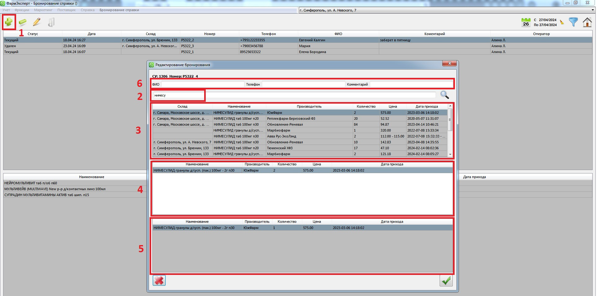 Раздел Учет → «Бронирование справки» реализует возможность создать заказ для клиента по телефонному обращению с последующим самовывозом из выбранной аптеки.