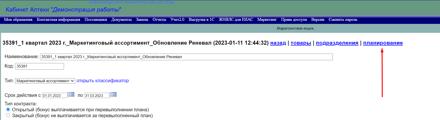 - Проанализируйте условия акции через раздел «Планирование». По загруженному маркетинговому контракту вы можете провести анализ его выполнимости и экономической целесообразности.