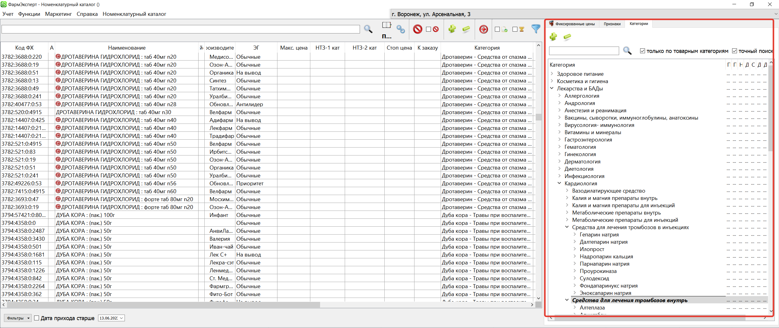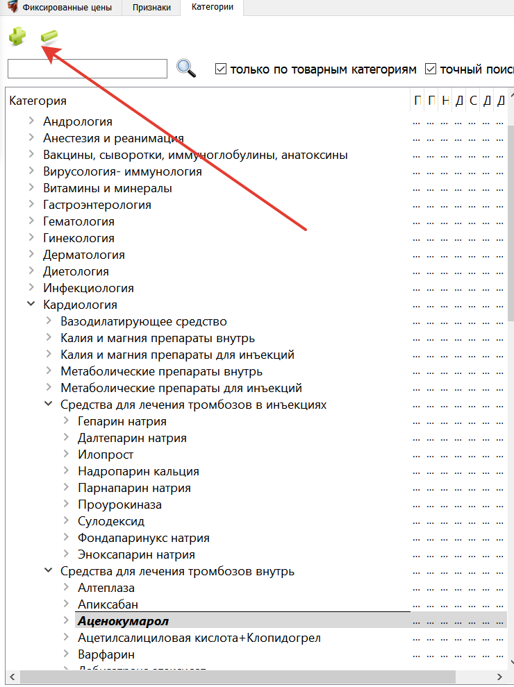 Если препаратам назначена потребительская группа, ее можно менять, перемещая товары между потребительскими группами в правой части (дерево иерархии потребительских групп). Нажмите и удерживайте левую клавишу мыши, переместите препарат/группу в новое место. Если необходимо добавить/удалить группу, в верхней части используйте кнопки «+/-». Присвоенную препарату группу всегда можно посмотреть в столбце «потребительская группа» напротив наименования.