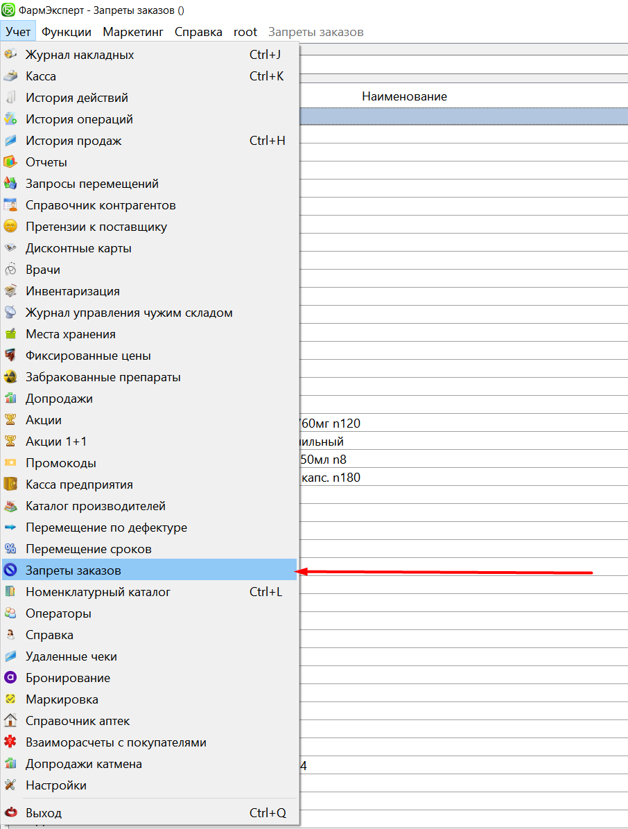 4. Ассортимент аптеки и аптечной сети можно просмотреть в разделе «Запрет заказа». Раздел позволяет