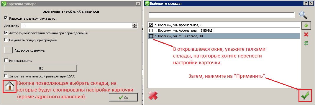 - Запрет разукомплектации, кроме позиций, для которых разрешено в карточке. Настройка располагается в блоке настроек работы с накладными. Установка или снятие галки распространяется на аптеку, где эта настройка производится. Доступно только оператору с привилегией администратора в вашей сети.