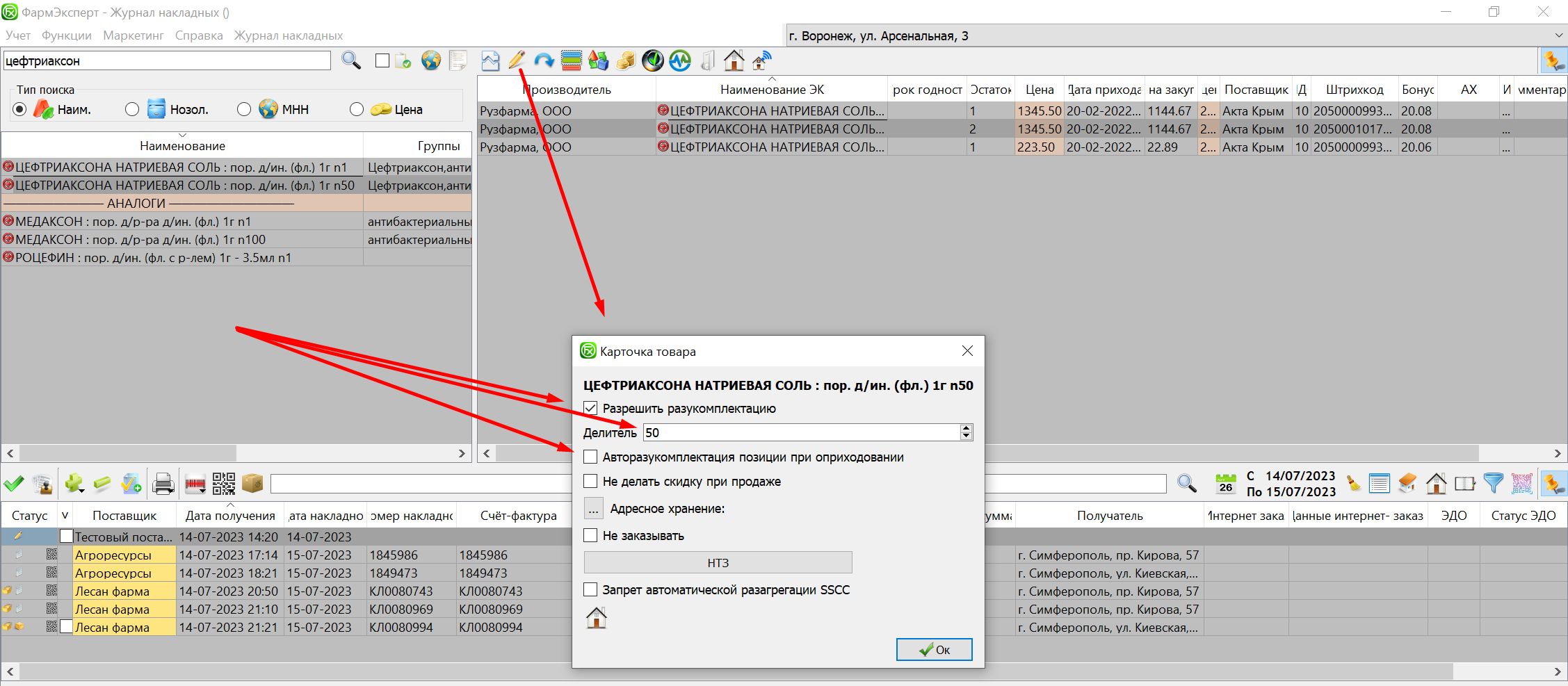 - Привилегия оператора «Разрешить разукомплектацию». Наличие данной привилегии дает право оператору устанавливать делитель в карточке товара, устанавливать разрешение на разделение этого товара в аптеке на кассе, а также установку режима авторазукомплектации, при котором прием накладной с данным товаром будет сопровождаться автоматической разукомплектацией на указанное в карточке значение. Дополнительно существует возможность из карточки управлять разукомлпектацией по подключенным аптекам (складам), отправляя им настройки.