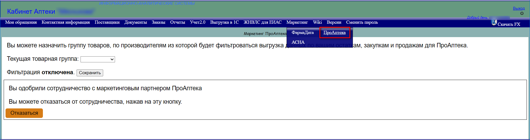 Для начала работы с маркетинговой системой «ПроАптека» вам необходимо подтвердить данный запрос от данной системы в личном кабинете аптеки. В этом же разделе вы можете отозвать согласие и прекратить передачу данных о движении товара предприятия.