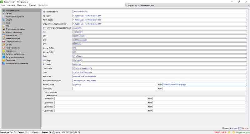 Реквизиты важны для заполнения, т.к. они необходимы во многих механизмах работы аптек, например, для отправки схемы 702 с типом 3, взаиморасчеты с контрагентами, работы с онлайн сервисами по бронированию лекарственных средств и т.д.