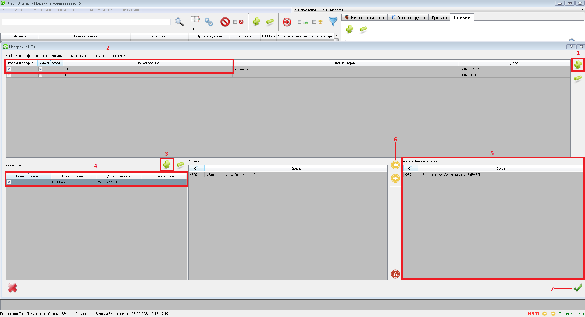 Затем, из блока «Аптеки без категорий» (5) перенесите их в нужную категорию (6). По завершении настроек, нужно нажать на кнопку (7). И перезаустить программу.