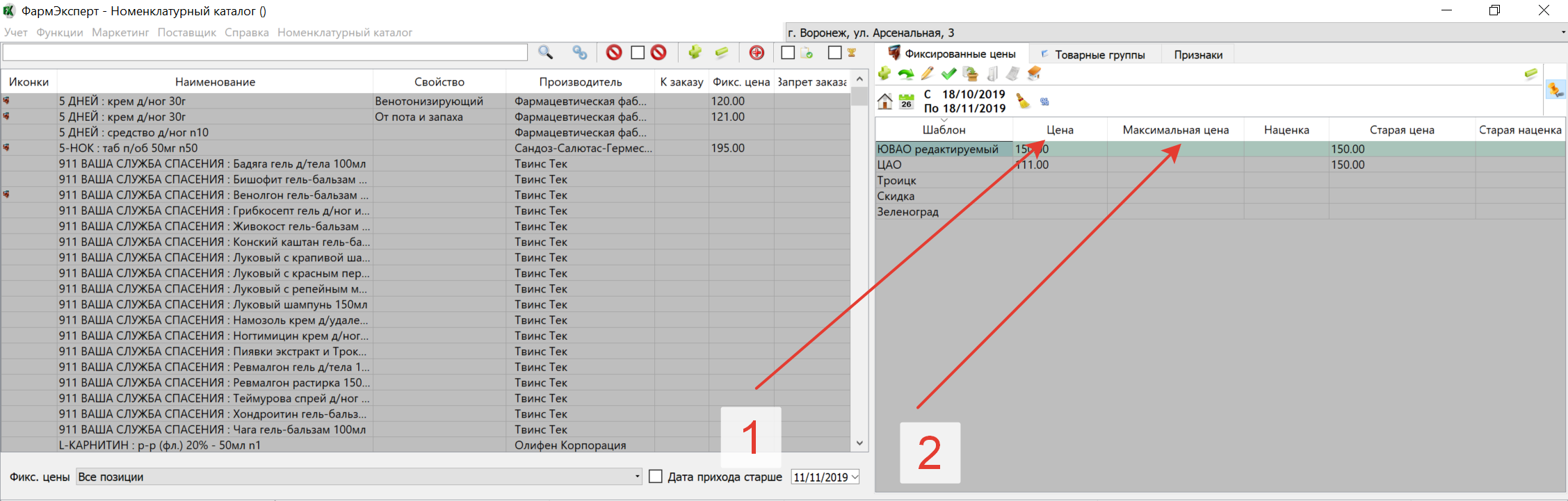 Шаблон фиксированных цен может работать как диапазон допустимых для расценки цен. В этом случае автоматическая расценка получаемых накладных будет происходить всё также по фиксированной цене из шаблона. И при этом сотрудник, имеющий привилегию изменения розничных цен, сможет её изменить в накладной, но не менее, чем фиксированная цена (1) и не более, чем максимальная фиксированная цена (2). Если верхнее (максимальное) значение цены не внесено, то ограничение «вверх» отсутствует