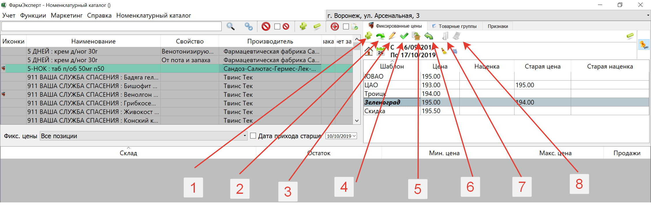 - Добавить новый шаблон (стрелка 1). Добавляет новый шаблон для установки фиксированных цен. Он создаётся пустой (без цен)