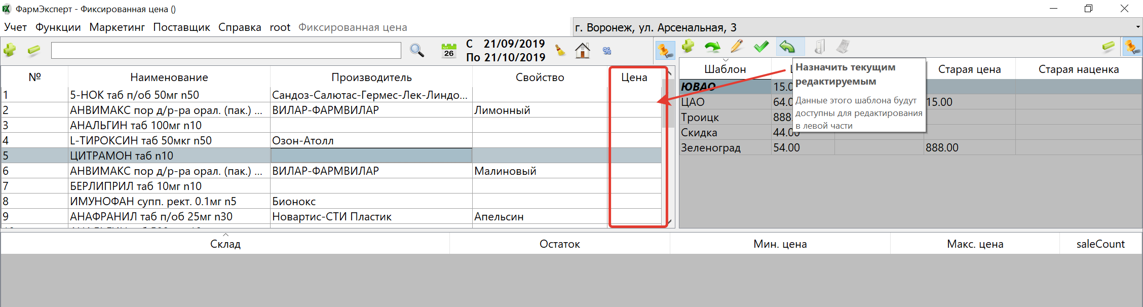 - Добавить новый шаблон (стрелка 1). Добавляет новый шаблон для установки фиксированных цен. Он создаётся пустой (без цен)