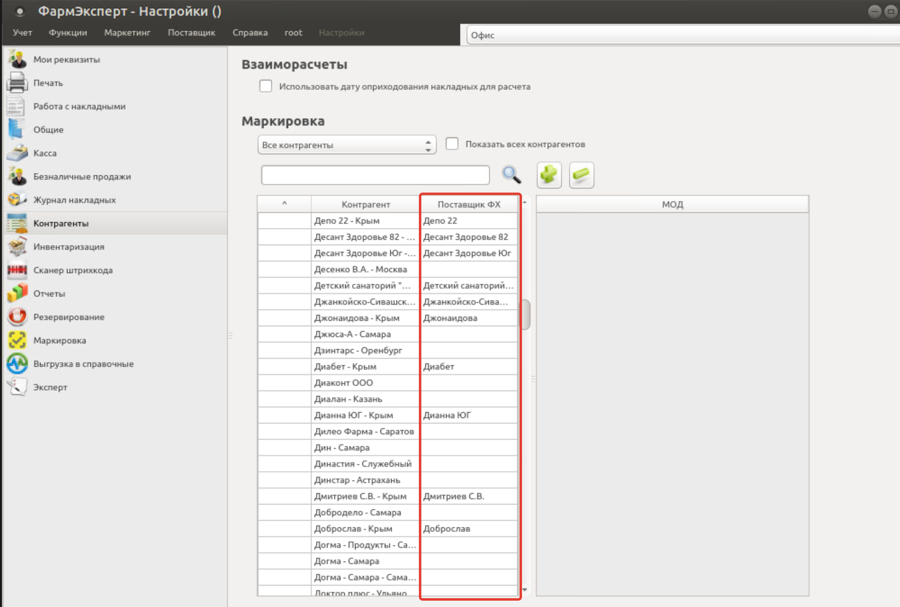 В таблицу с контрагентами добавлено отображение поставщика в программе ФармЭксперт. Это те контрагенты/поставщики, от которых поступают наклданые в вашу аптечную сеть. Таким образом для работы с МДЛП и приёмки от них маркированного товара, необходимо внеси МОДы по контарентам, имеющих соответствие с контрагентом ФармЭксперт.