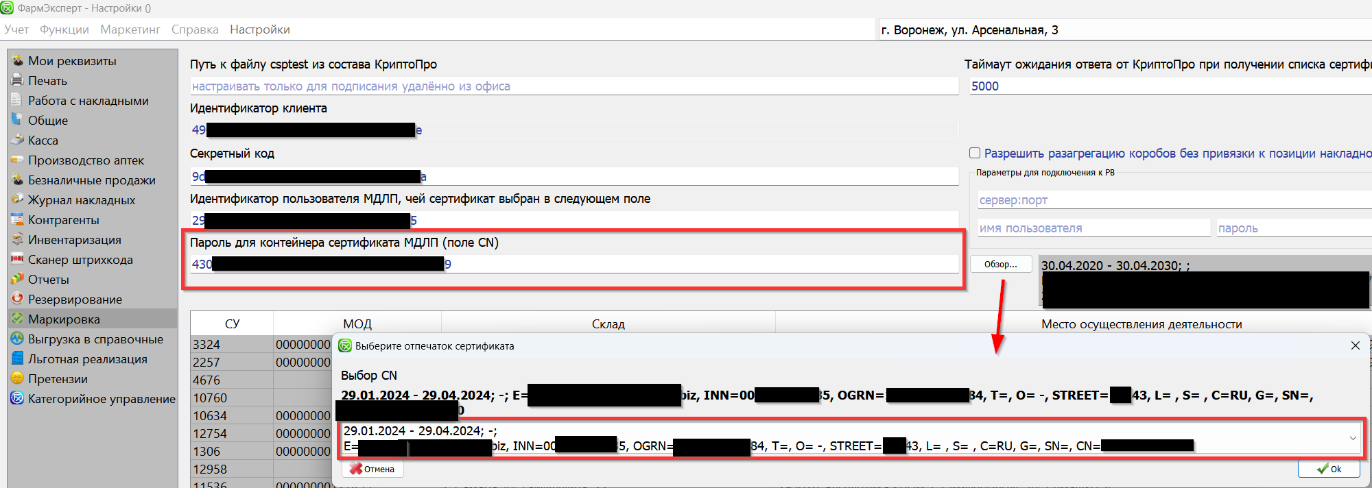 6. После добавления обновленной подписи на главный ПК в аптеке и установки из нее того сертификата, следует зайти в Учет - Настройки - Маркировка и через кнопку Обзор выбрать новый сертификат. Проверить правильность введенных данных можно по этой инструкции