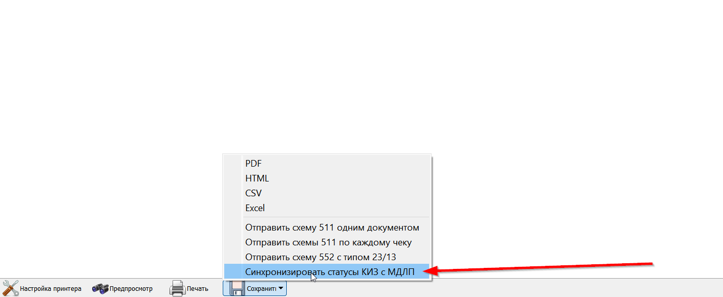 - В отчете провести вручную синхронизацию КИЗов по вашему МОД (ФармЭксперт проводит ежесуточно в полночь автоматическую синхронизацию статусов для контроля работы Честного Знака, поэтому рекомендуем оставлять основной ПК в аптеке всегда включенным).