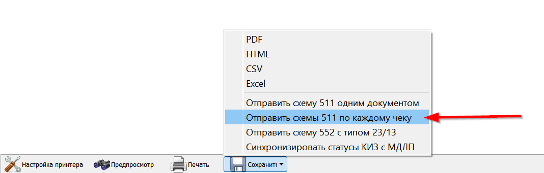 - Отправить из отчета документы в Честный Знак по КИЗам , имеющим конфликт статуса. Рекомендуем это делать путем отправки 511-х документов по количеству совершенных продаж с проблемными КИЗами.