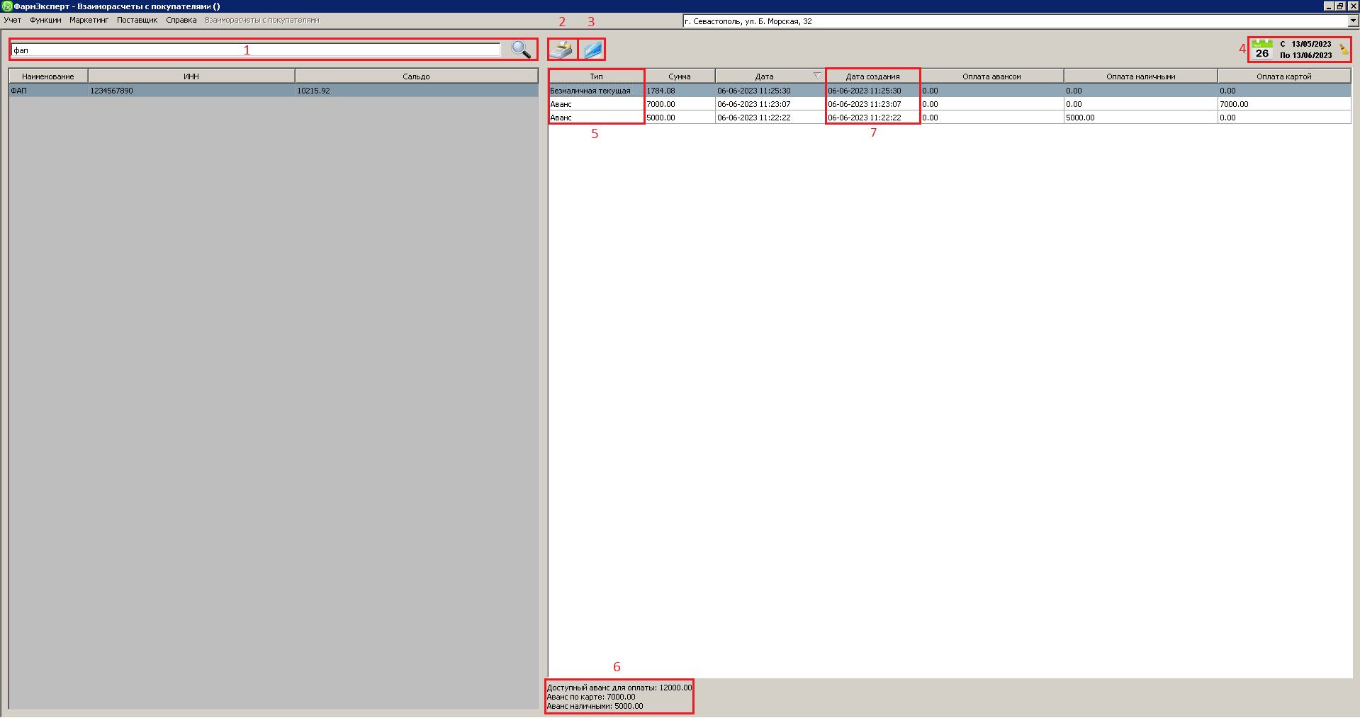 Данный раздел предоставляет возможность просматривать информацию по авансовым платежам и продажам, созданными для выбранного контрагента, а также, проводить безналичные продажи через ККМ с оплатой авансом, наличными или картой. Он тесно взаимодействует с разделом "касса". В самом разделе перечислены те контрагенты, которые ранее были вручную добавлены в "справочник контрагентов". Т.е. сначала необходимо создать контрагентов и заполнить их реквизиты. Обязательными являются ИНН, т.к. он необходим для проведения продаж с типом «Аванс», номер договора — Договор номер и дата заключения договора.