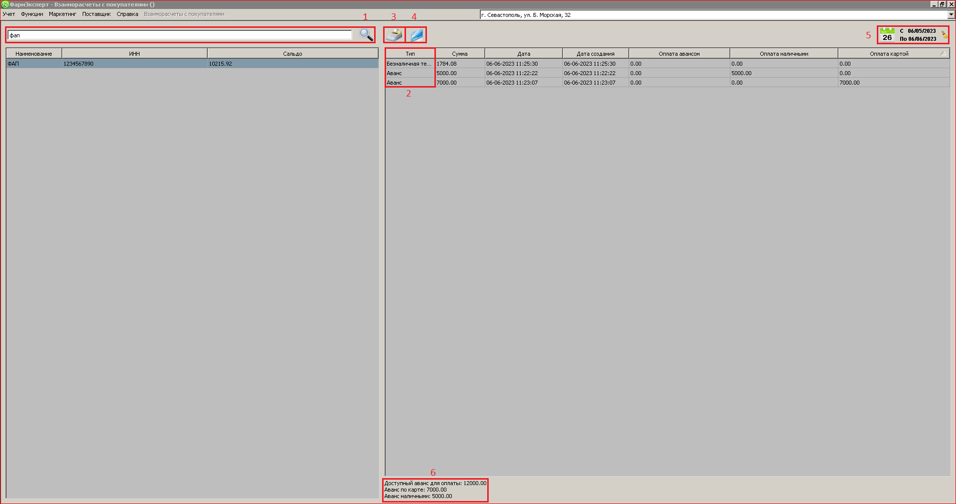 Чтобы провести ранее собранную продажу, выберите «Учет-Взаиморасчеты с покупателями». Введите в строку поиска (1) наименоваие контрагента, по которому хотите провести продажу. В колонке «Тип» (2), указан тип документа. Строки, которые отмечены в этой колонке, как «Безналичная текущая» - являются продажами, которые еще не провели. Для того, чтобы провести такую продажу, выберите ее и нажмите на кнопку «Добавить безналичную продажу в чек» (3). После чего, откроется раздел «Касса», где вы увидите содержимое чека и сможете провести его через ККМ используя доступную сумму аванса (6).