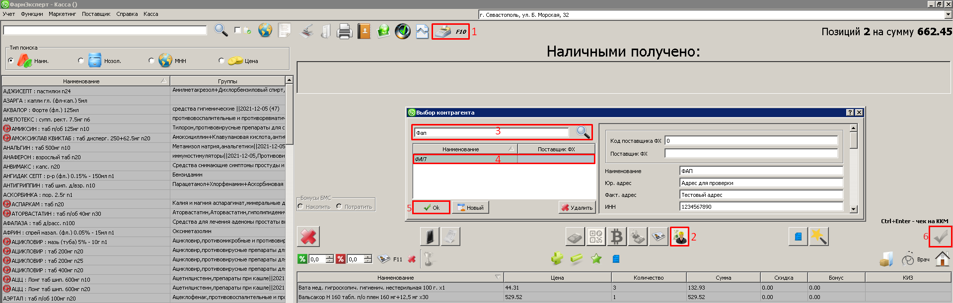 Процесс создания безналичной продажи для взаиморасчетов, практически не отличается от создания обычной безналичной продажи. Т.е. вам нужно собрать позиции в чек, внести КИЗ'ы и нажать на «F10» (1) и выбрать тип оплаты «Безнал» (2). После выбора способа оплаты, появится список контрагентов. Где вам нужно найти контрагента (3), на которого вы оформляете продажу. Кликните на его наименование (4) и нажмите кнопку «Ок» (5).Останется только подтвердить действие (6).
