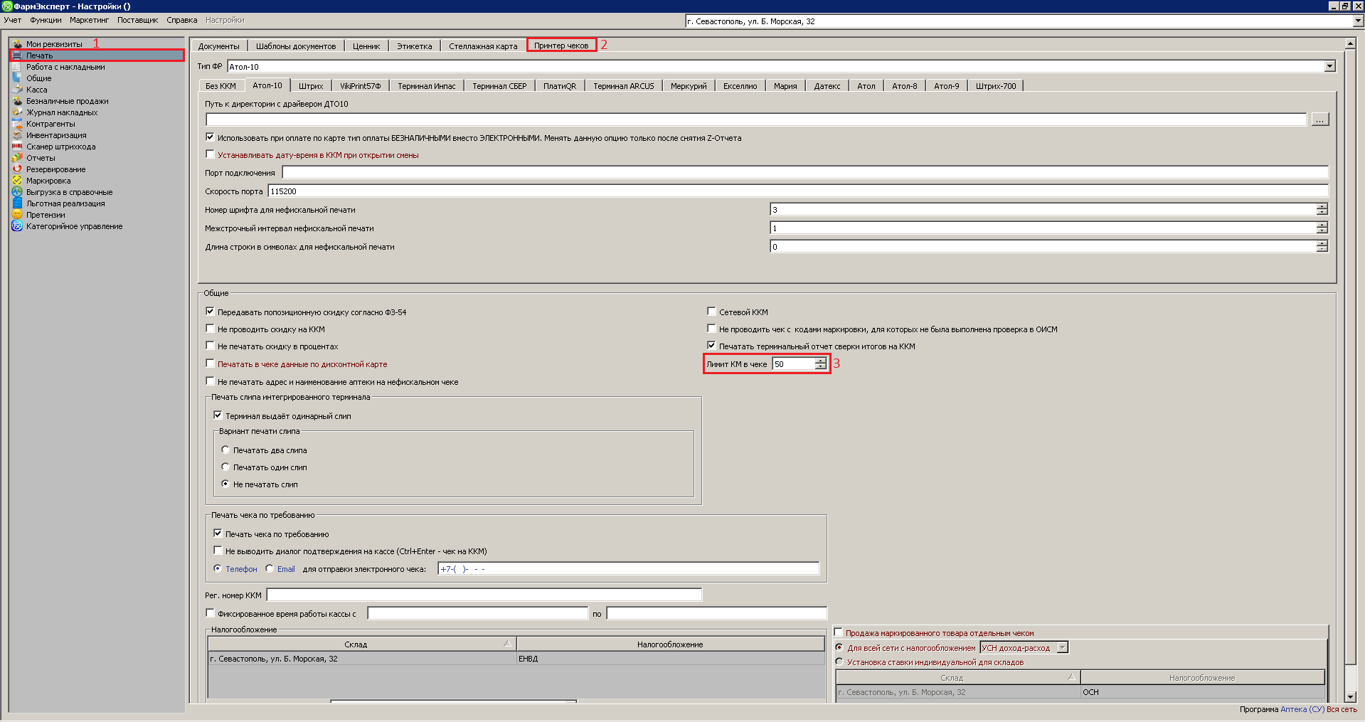 Также, рекомендуем установить лимит КИЗ'ов в чеке. Т.к. разные конфигурации ККМ, имеют свои ограничения по кличеству КИЗ'ов. Установить лимит через ФармЭксперт, можно в Учет-Настройки-Печать-Принтер чеков