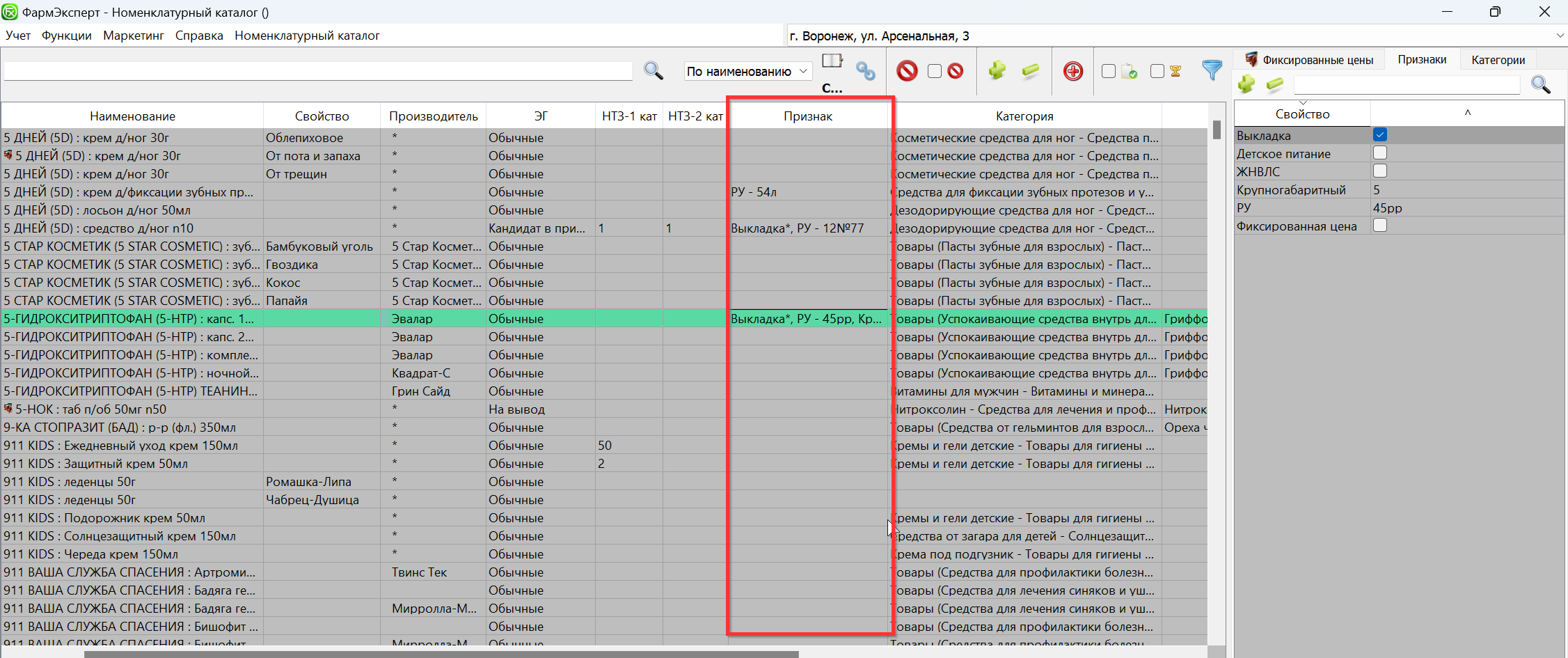 - В Номенклатурном каталоге добавлено отображение признаков по товарам дополнительно в отдельной колонке. Упрощает и делает более наглядной работу оператора с данными признаками.