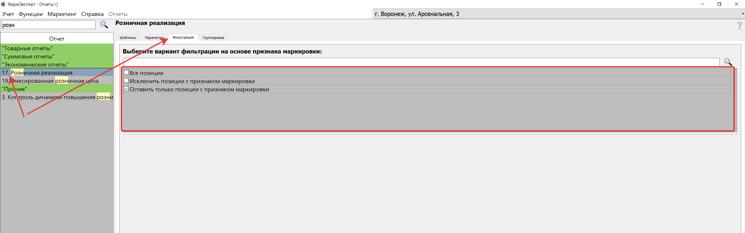 5. В отчет «Розничная реализация» добавлена возможность фильтрации маркированных товаров
