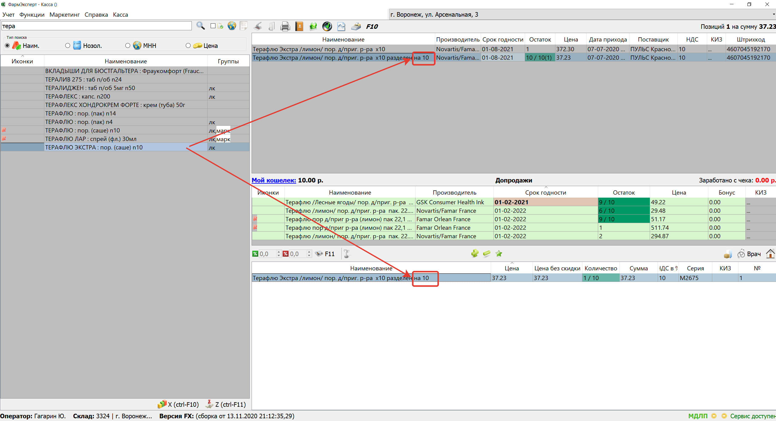 6. При автоматическом делении или делении через указание дроби на кассе к названию препарата добавляется информация, сообщающая, на сколько он был разделен. Это позволяет отображать в товарном чеке наименование с указанием, на сколько разделено