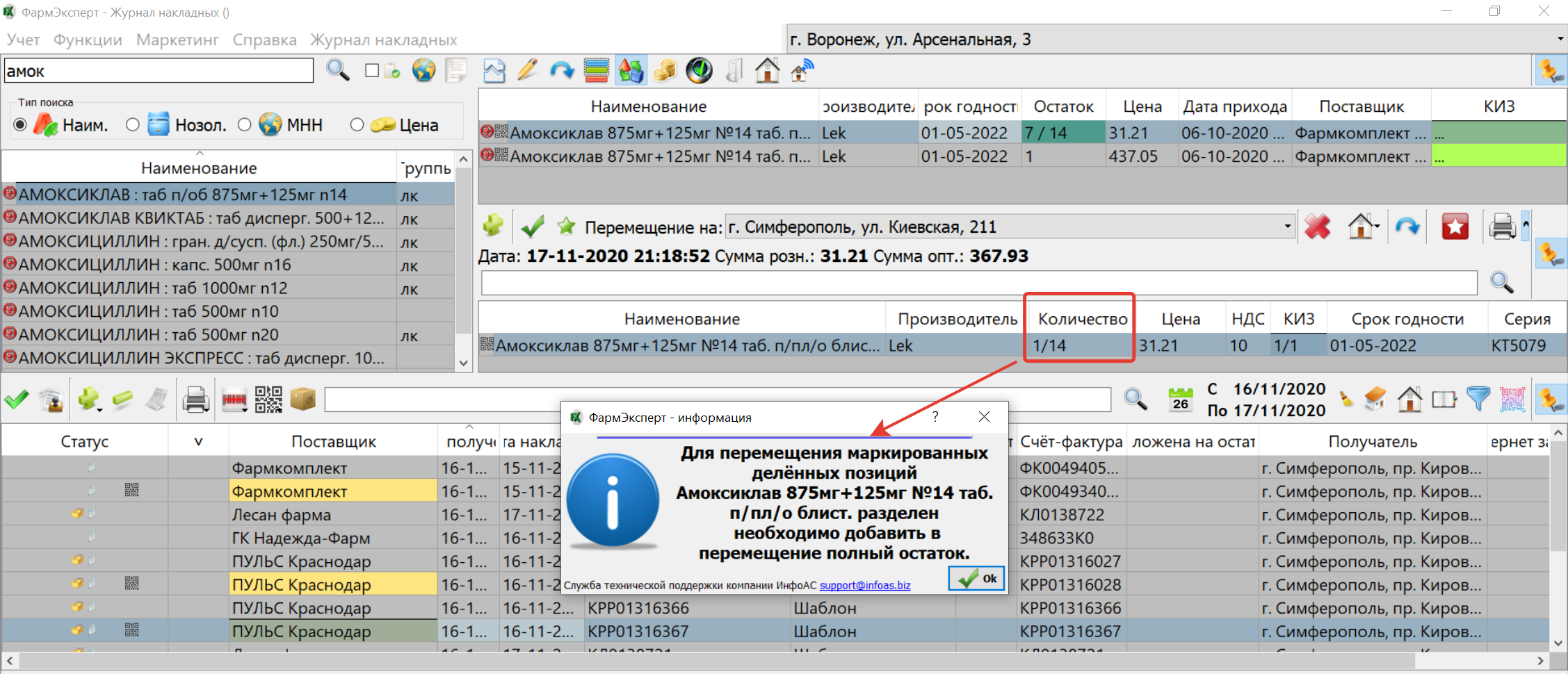 15. Закрыта возможность перемещать разделенный маркированный товар из-за отсутствия поддержки данной функции со стороны МДЛП (КИЗ не может одновременно находиться на двух МОДах)