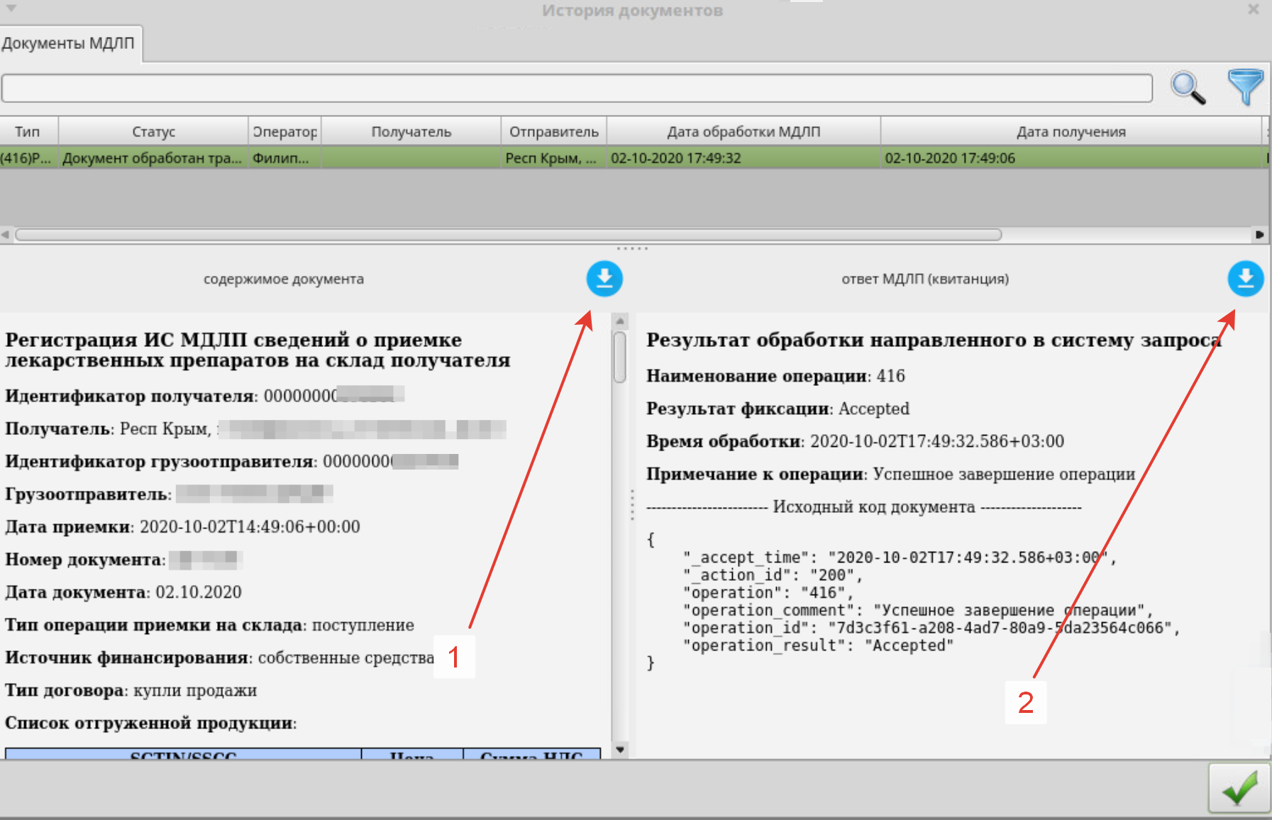 10. В продолжении этого же функционала, открывающееся окно со списком документов МДЛП, связанных с выбранной накладной, содержит кнопки скачивания документа-первоисточника (стрелка 1) и квитанции по нему (стрелка 2). Напомним, что по правилам МДЛП квитанция бывает только у исходящих документов.